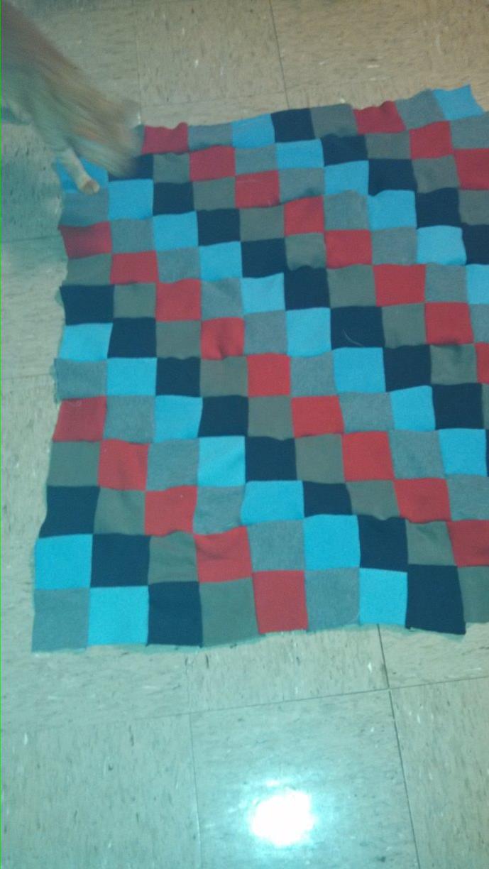 My sweatshirt quilt is almost finished. Just a couple more dedicated hours and it’s set to be done. Backing and trim and that’s all she wrote.
