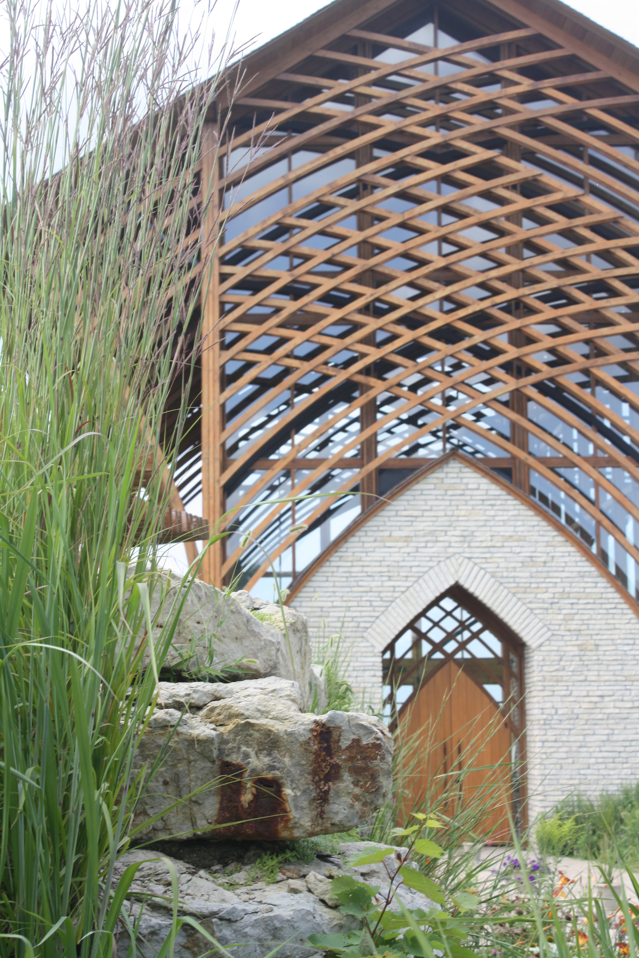 After the zoo, we stopped at the new Nebraska Crossing Outlet Mall. This place is a shopper’s paradise. If I wasn’t so strapped for funds (and had a bigger bag to bring back), I would have gone berserk. While my parents and the youngest were back-to-school shopping, the middle sister (I call her Sib–short for sibling) and I popped across I-80 and checked out the Holy Family Shrine. This building is one we’ve driven by thousands of times and always thought it was so cool. The walls are all glass and you can see inside from the interstate below. Needless to stay, it is absolutely stunning up close.