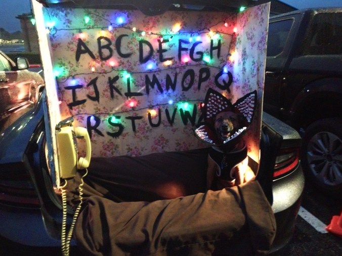 We didn’t snap any pictures of our own costumes but we dressed as Steve and Nancy. We should have won (had there been a contest), but since the Mister didn’t get off work until after the Trunk or Treating started, we didn’t have enough people get a good look at it.
