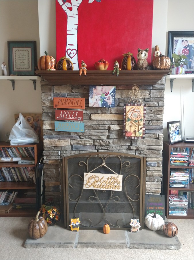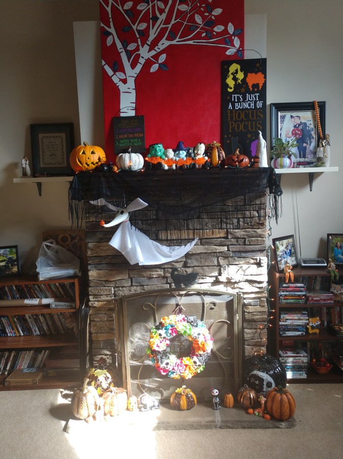 We didn’t give out candy on Halloween (the doorbell/knocking makes Audie crazy), but I did get my fireplace decorated for Halloween/Dia de Los Muertos.