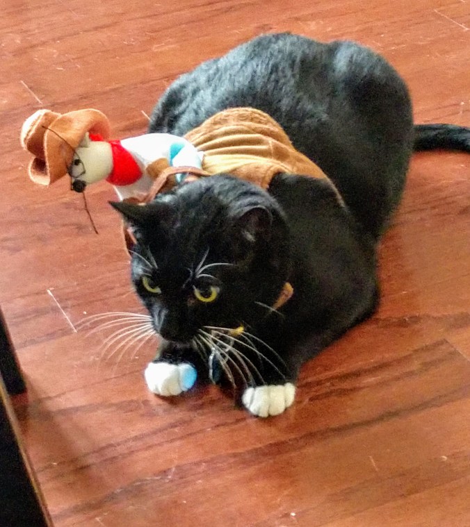 Taz took her costume the worst. She does not like being ridden by a cowboy mouse.