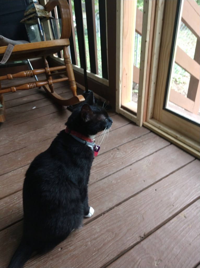 Since moving, Hina has been adjusting to living on the covered deck. The Mister doesn’t want her to mess up the new floor laminate/carpets in the house, so he screened in the deck for her to be safely contained. She loves being out there during the day, but I think she gets very lonely at night. For the 4th, I’ll be bringing her inside so the neighborhood fireworks don’t cause her stress. She’s done really well with the litter box since the transition. We’ll see if this has to be permanent.