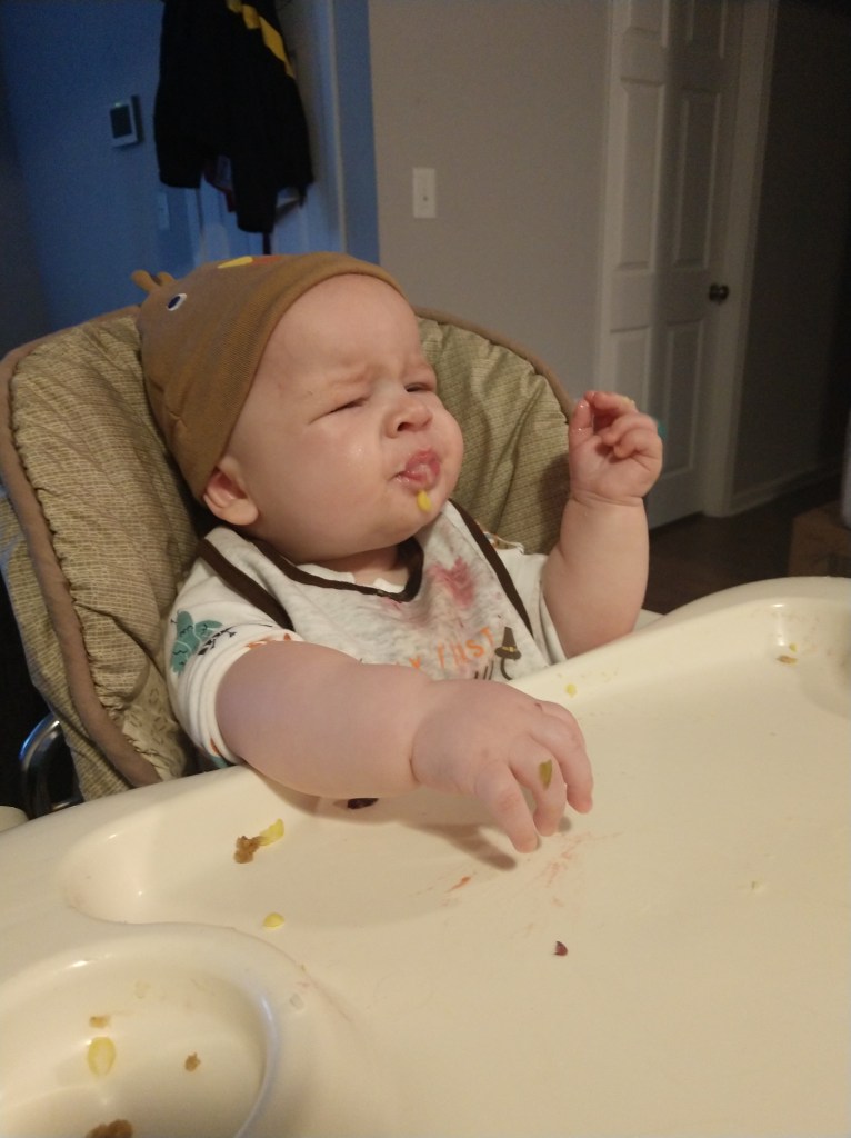 He got to try some real, solid foods finally. He was definitely ready for them. He likes to grab at the spoon or use his hands to try things — all without prompting! So smart.