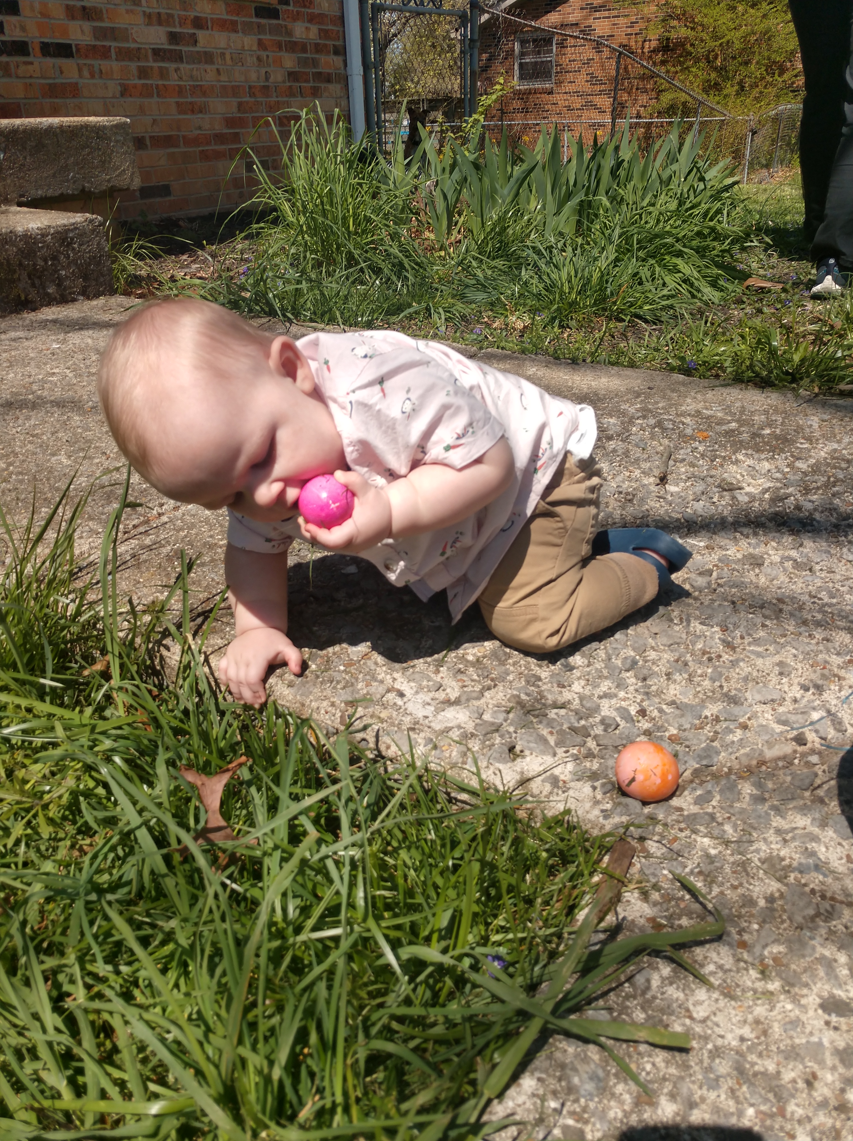 We dyed eggs and did a little front yard hunt. Basically it was just killing time while the ham finished cooking. He just wanted to chew on them, not look for them.