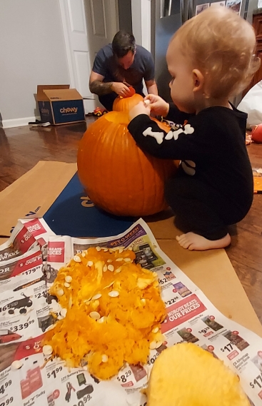 We ended up carving pumpkins and staying home to watch Halloween movies. I think next year we’ll try trick or treating. Since Little Man doesn’t say much yet, it will be better that way.