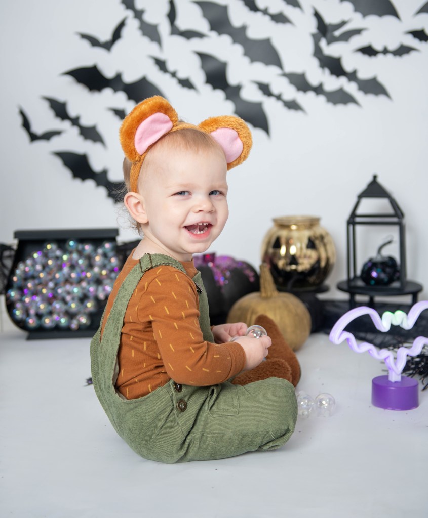 His costume ended up being a nightmare to put together. Originally, I had a teddy bear costume ordered to go with the overalls but it never showed (thanks to delays in shipping/supply chain issues). So I had to hustle to find all the pieces.