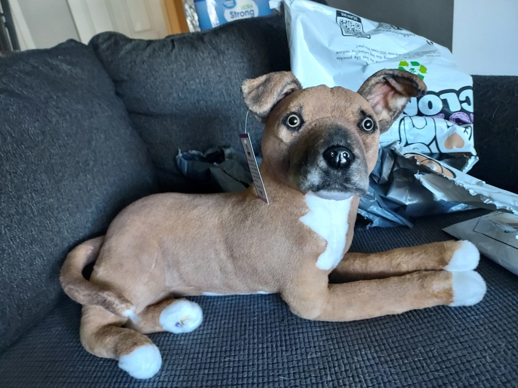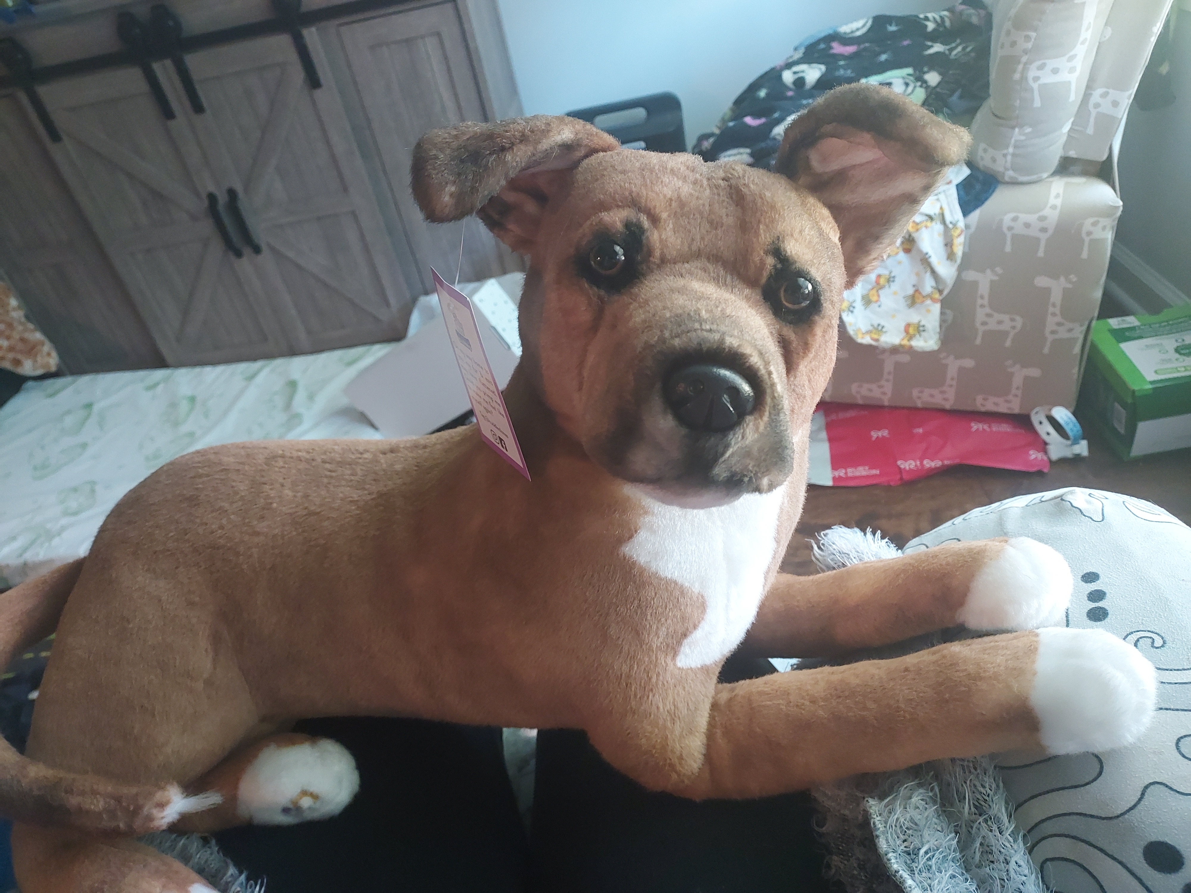 Speaking of being overwhelmed…I finally received one of what I’m calling my “grief purchases” from Audie’s passing. On the day we took him to the vet, I ordered a custom stuffed animal that was promised to look like him. The original took about 8 weeks to receive. I was disappointed to see the face was wrong and the eyes were damaged/the wrong color.