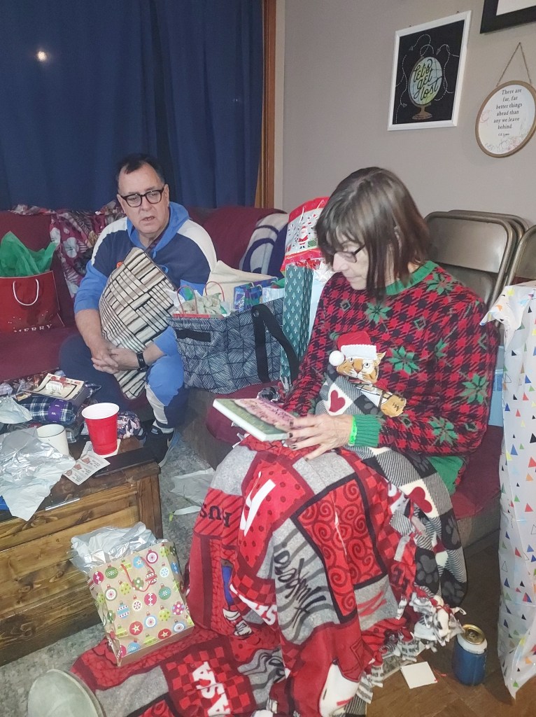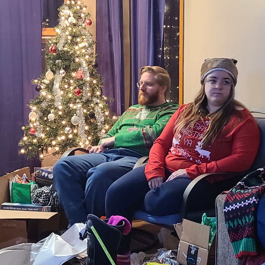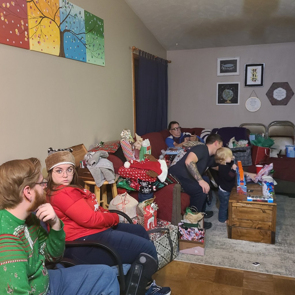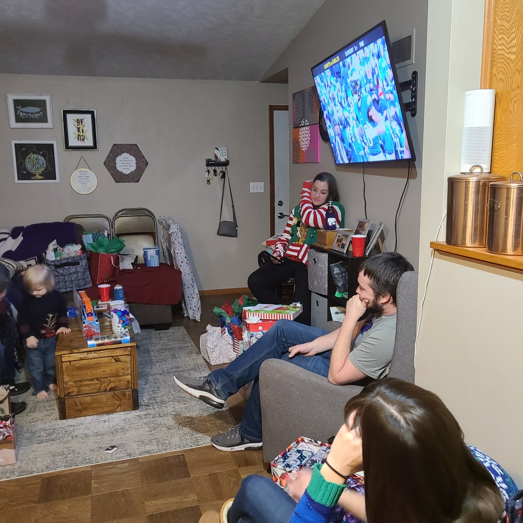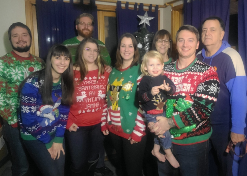 We decided to do ugly Christmas sweaters. Dad’s didn’t arrive until an hour after we tried to pick it up. 😑 Thanks for nothing, Kohls!Middle sister’s pup ChevyMy youngest sister with her boyfriend BryanMiddle sisterMiddle sister and her boyfriend Darrell as well as myselfBryan, youngest sister, The Mister, Little Man, my dad.Mom and dad