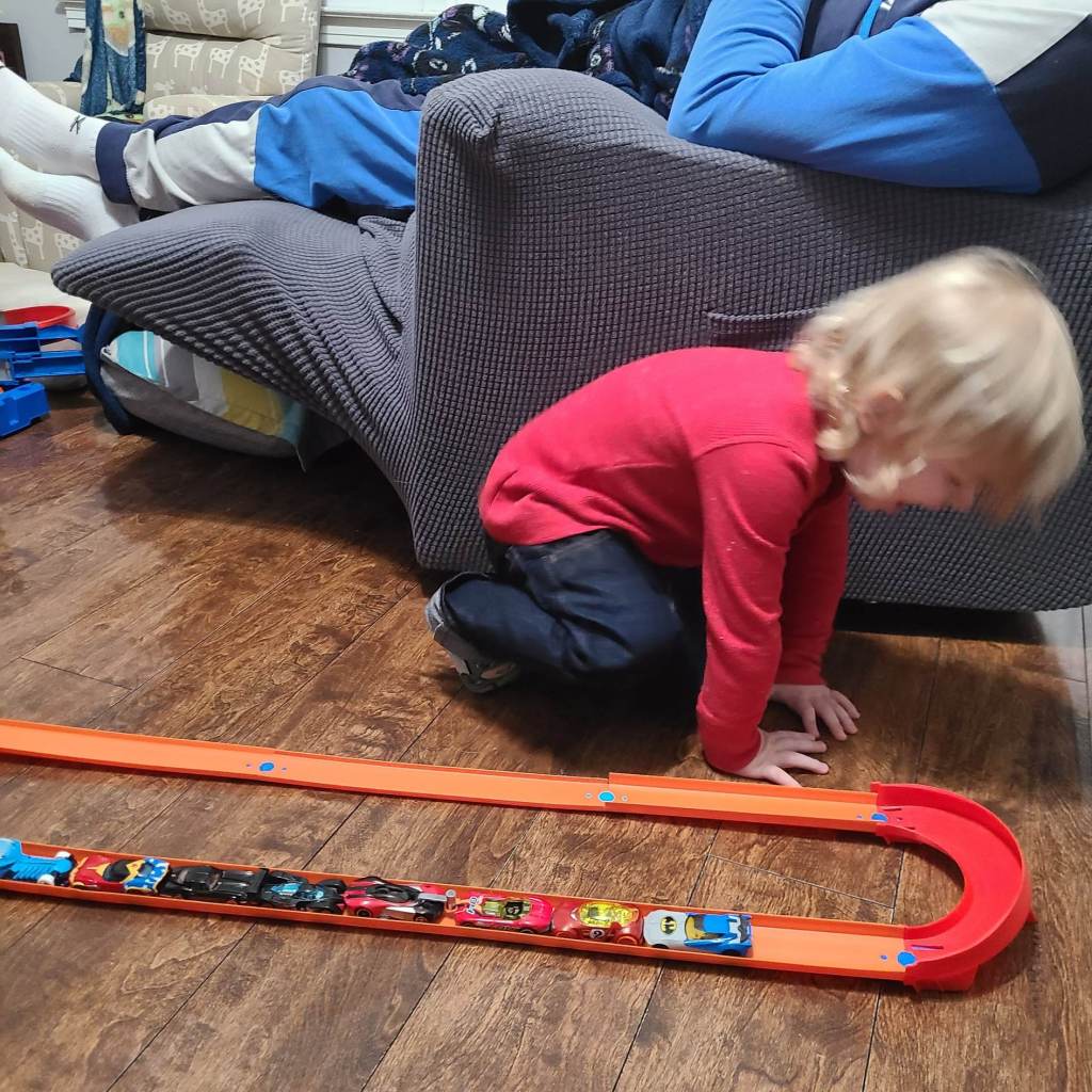 He is also using sign language more frequently when he’s asking for things (he signs “more” quite a bit for things he’s excited about — like extra bananas when he’s already woofed down two). He is really into matching things lately, like things of the same color. We have lots of “geen” (green) and “ingk” (pink) in our house and we see lots of “ed” (red) and “due” (blue) out and about.