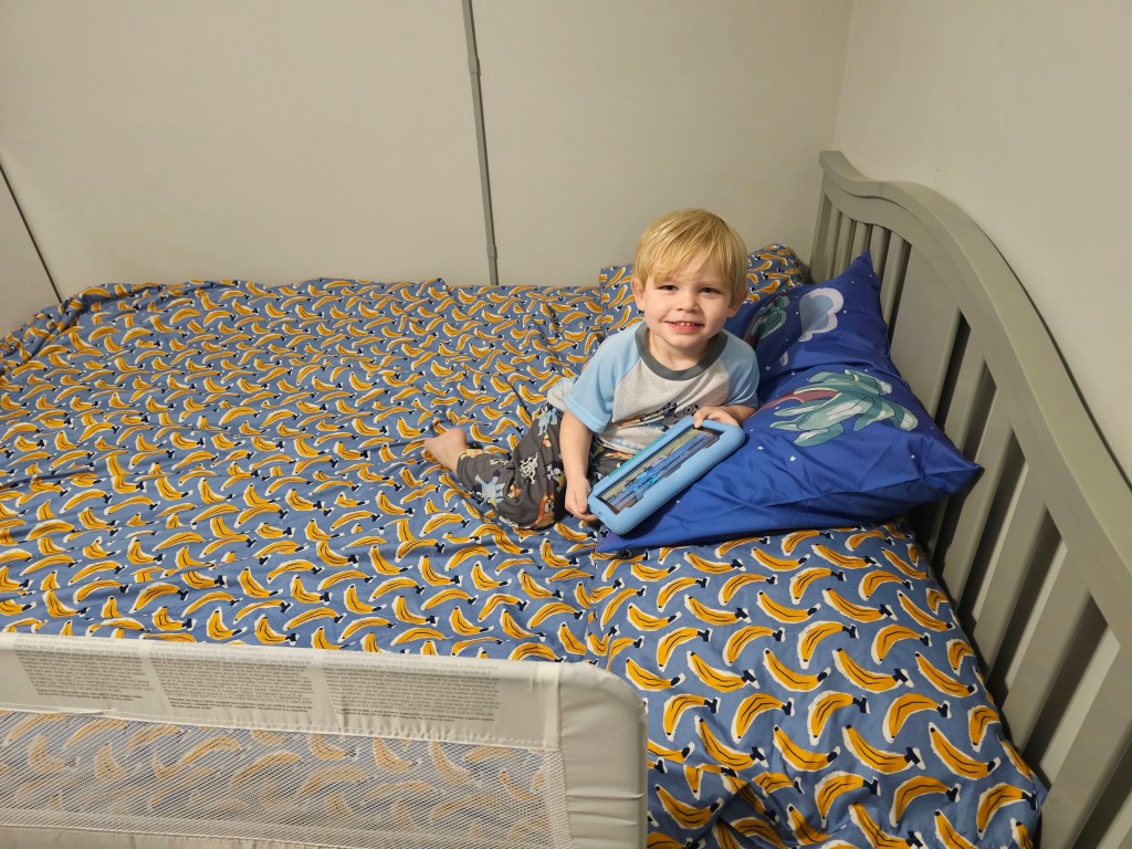 He picked out the banana sheets himself. His comforter has Bluey and stars on it, which he also picked out a while ago. Now, he’s all about “ickey’s club owwwse” (Mickey’s Clubhouse), but hey. Haha. Nana is sending him some Mickey sheets she picked up on the dollar auction, so he’ll be thrilled to mix and match his favorites.