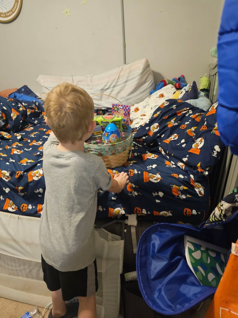 His big egg had a note from the Bunny and his basket was ready for him on his bed, full of Super Mario goodies.