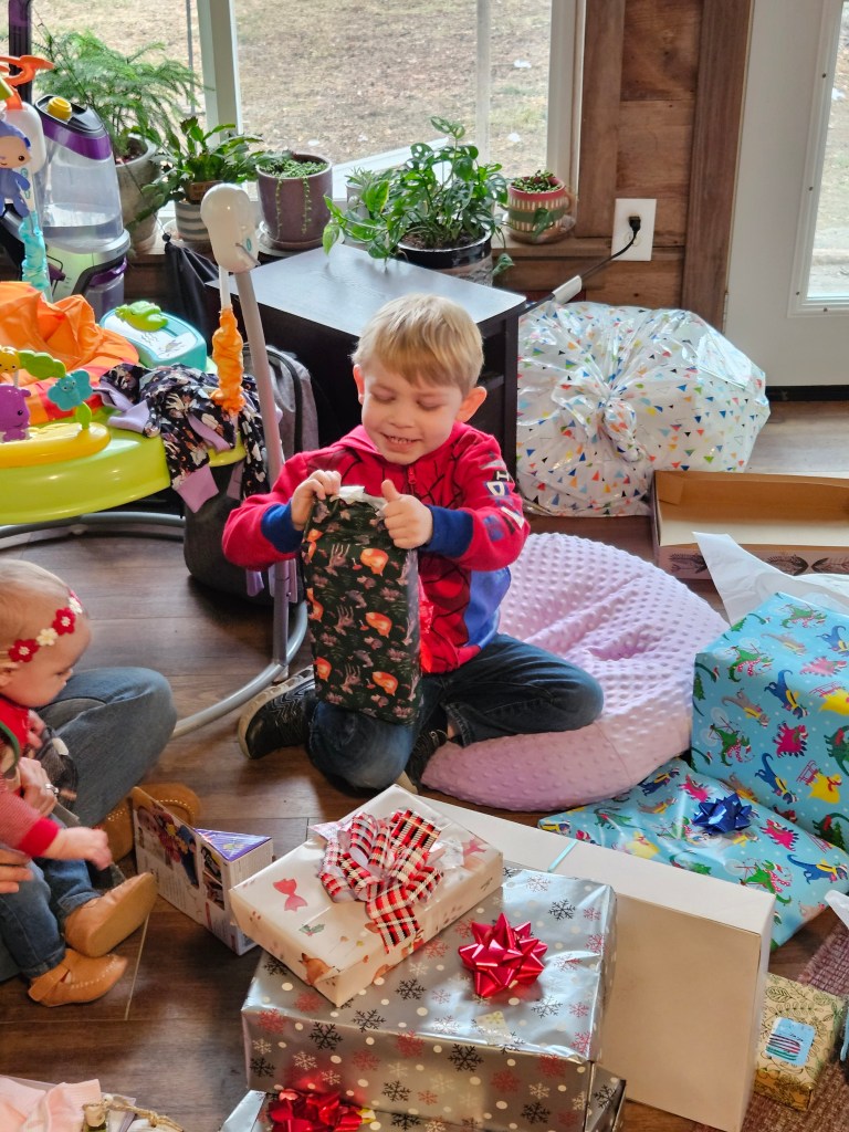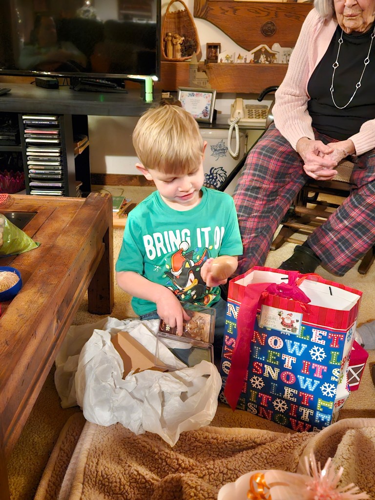 Opening gifts from Aunt Whitney and Uncle Bryan.